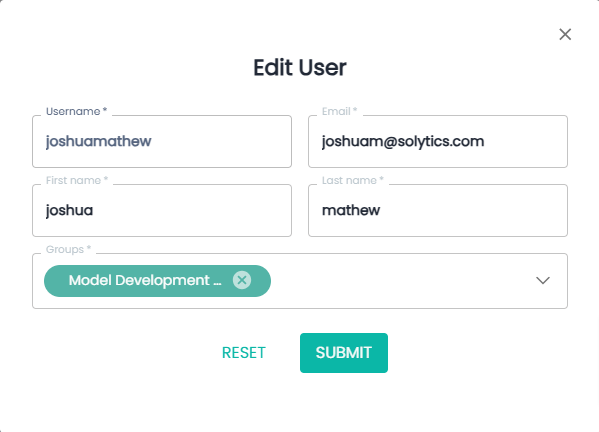 Edit User: Editing details of existing users such as email, first name, last name, groups.